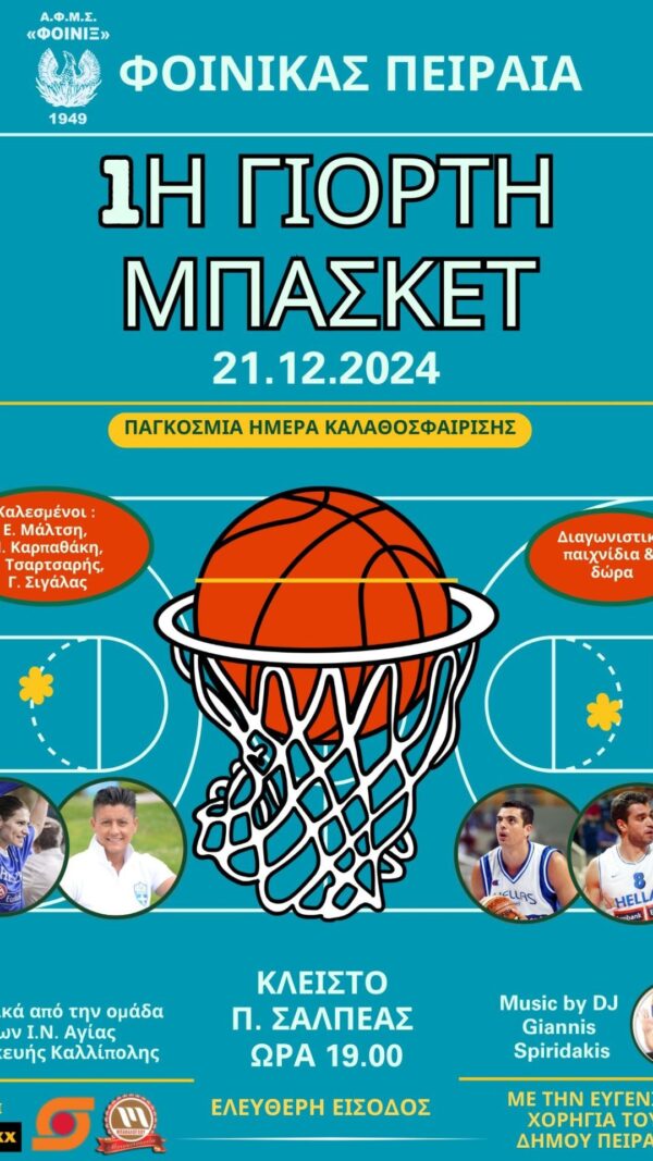 By piraeus365Μια μεγάλη μπασκετική γιορτή με αφορμή την Παγκόσμια Ημέρα Καλαθοσφαίρισης (που έχει καθιερωθεί από τον ΟΗΕ) διοργανώνει ο αθλητικός σύλλογος Φοίνικας Πειραιά το...