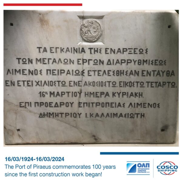 By piraeus365Piraeus Port Authority-PPA/OLP-COSCO Shipping Σήμερα συμπληρώνονται 100 χρόνια από τα εγκαίνια της ενάρξεως της κατασκευής των μεγάλων έργων του Λιμένος Πειραιώς και μαζί...