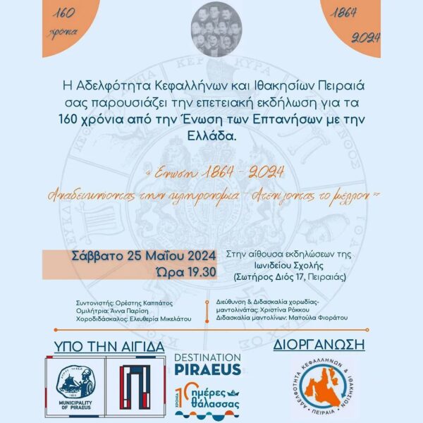 Εκδήλωση από το χρήστη Ημέρες Θάλασσας Αίθουσα εκδηλώσεων Ιωνιδείου Σχολής Πειραιά Δημόσια · Οποιοσδήποτε εντός ή εκτός Facebook Η Αδελφότητα Κεφαλλήνων & Ιθακησίων Πειραιά γιορτάζει τα...
