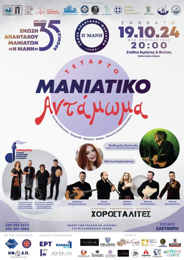 Η Ένωση Απανταχού Μανιατών «Η Μάνη» γιορτάζει 35 χρόνια από την ίδρυσή της και σας προσκαλεί στο 4o Μανιάτικο Αντάμωμα το Σάββατο 19...
