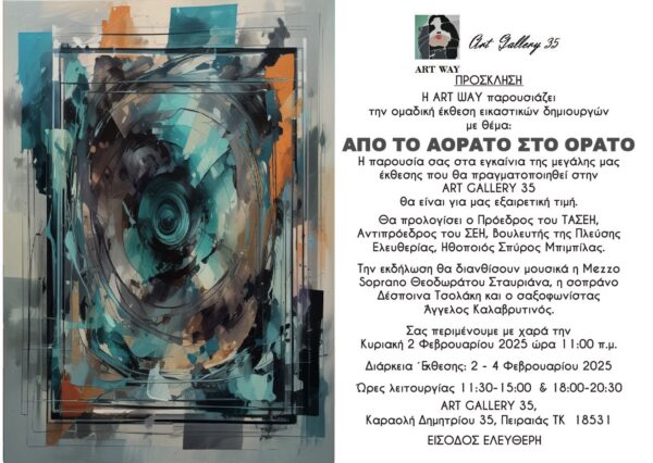 Εκδήλωση από τους Αφροδιτη Δρακοπούλου Σάρδη και Αφροδίτη Δρακοπούλου Σάρδη Art-gallery35 Διάρκεια: 3 ημέρες ART GALLERY 35(Καραολή Δημητρίου 35, Πειραιάς)και ART WAY παρουσιάζουν2-4 ΦΕΒΡΟΥΑΡΙΟΥ 2025Ομαδική Έκθεση...