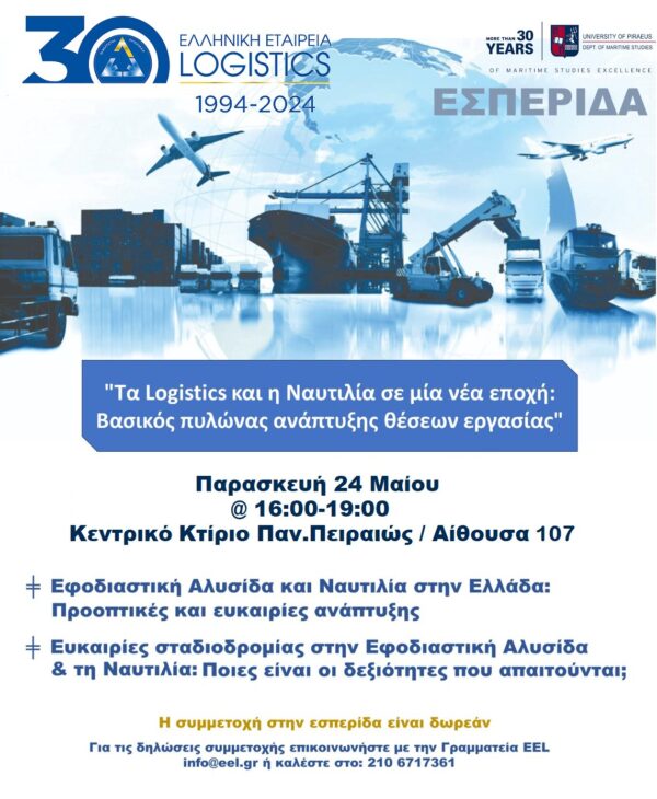 By piraeus365H EEL διοργανώνει την Παρασκευή 24 Μαΐου, σε συνεργασία με το Τμήμα Ναυτιλιακών Σπουδών του Πανεπιστημίου Πειραιώς, την εσπερίδα ¨Τα Logistics & η...