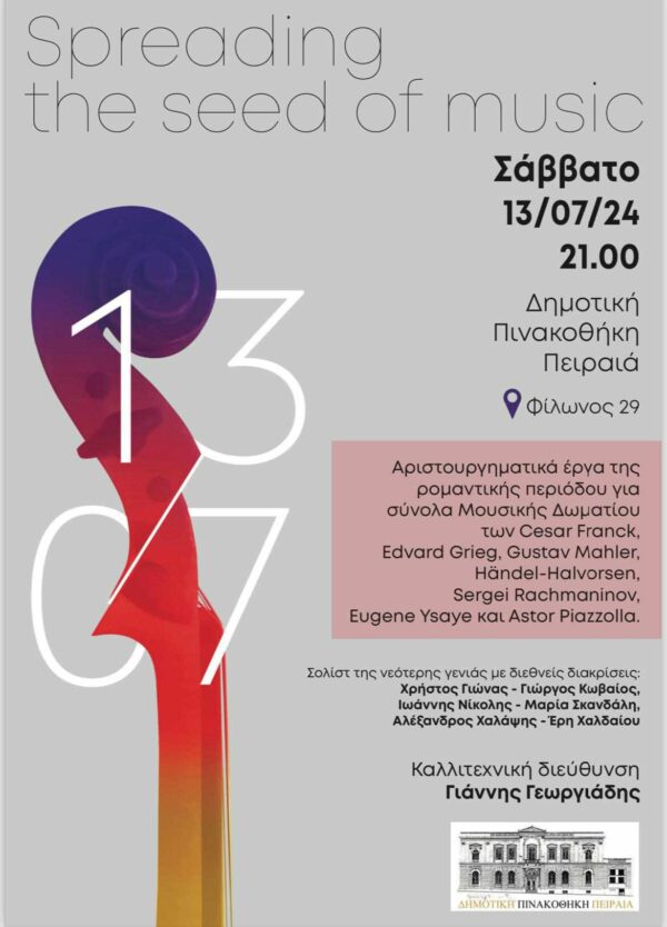 Το Σάββατο 13 Ιουλίου 2024 στις 21:00 σας περιμένουμε στη Δημοτική Πινακοθήκη Πειραιά στην μουσική εκδήλωση “Spreading the seed of music”, μια επιλογή...